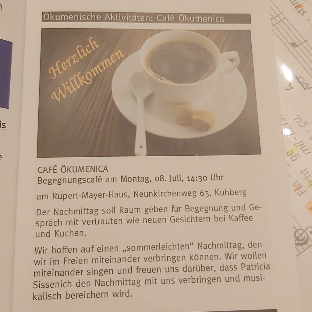 Ein weiteres Highlight war auch in diesem Jahr wieder das „Cafè Oecumenika, das ich als ökumenisches Treffen der älteren Ulmer Generationen verstehe. Dieses Mal mit dem Titel „NGL-Workshop. Dabei ging es u.a. auch um das Kennenlernen noch unbekannterer aber auch schon besser bekannteren, Neuen Geistlichen Liedern“ und hierbei stellten wir fest, dass die Katholischen LIedermacher auch im Evangelischen Gesangbuch (bzw. im blauen Büchlein „Wo wir dich loben, wachsen neue Lieder+“ eindeutig die Nase vorne haben 🙂
