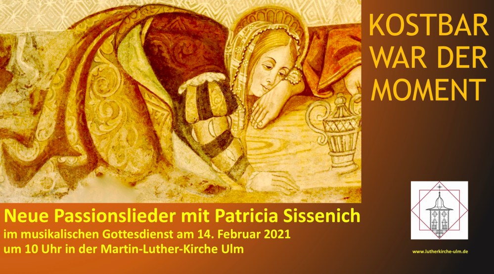 Konzerte sind aus gegebenem Anlass im Frühjahr 2021 noch nicht möglich, aber musikalische Gottesdienste mit kleiner Besetzung schon. Ich stelle im Gottesdienst am Sonntag, den 14. Februar um 10 Uhr in der Ulmer Martin-Luther-Kirche zusammen mit Andreas Wiedenmann neue Passionslieder vor, die zum Teil erst in den vergangenen Jahren entstanden sind. Daher werden diese Lieder von der Gemeinde noch nicht in vertrauter Weise gesungen, sie sind aber eindrücklich: