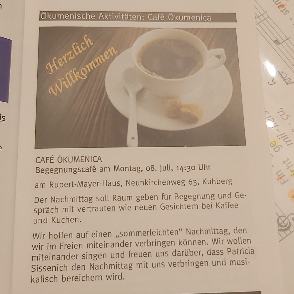 Am 8. Juli 2024 war ich einmal wieder als Referentin beim Café Oekumenica eingeladen. In regelmäßigen Abständen wird dieses Projekt von der Kath. St. Elisabethengemeinde und der Evangelischen Martin-Luther-Gemeinde veranstaltet.